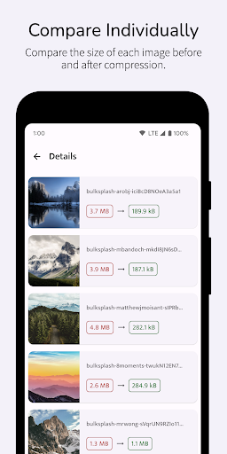 Compress multiple images simultaneously and save time. Image Compressor helps you reduce over 80-90% of your image size. Image Compressor will allow you to compress large photos into smaller-sized photos with very less or negligible loss in quality of the image.