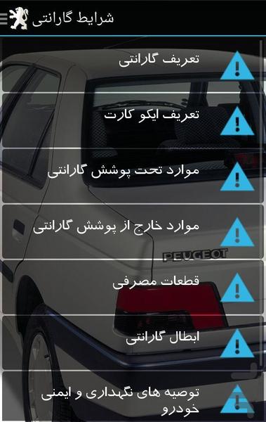 آگاهی از ضوابط گارانتی خودرو نیز به شما در کاهش هزینه های تعمیرات و نگهداری خودرو کمک بزرگی می کند. ما این اطلاعات را نیز به صورت دسته بندی شده در آورده ایم و در برنامه گنجانده ایم. شما علاوه بر امکان مرور مطالب، در این بخش نیز با جستجو می توانید اطلاعات مورد نظرتان را بیابید.