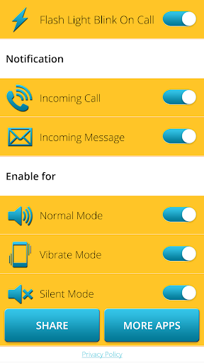 You will use "Flash Light Blink On Call" when phone ring flash light blink! Also, you can opt for message notification light! Incoming Call Flash Light uses a LED indicator that shines bright so you can see it anytime, anywhere! Front flash light torch will blink on the front of your cell phone! Enable Led flash for alerts for different modes: normal mode, vibrate mode or silent mode. Don't forget to set start and end time for call alert and SMS alert notifications. Get flashlight alert for notifications right now and stay up to date with newest customization apps! You get to choose whether you want slow or fast blinking flash alert on call!