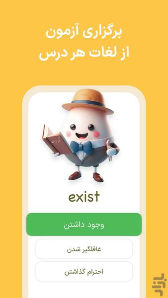 آزمونهای سهگزینهای: بعد از یادگیری لغات هر درس، یه آزمون سهگزینهای برگزار میشه تا بتونی خودت رو به چالش بکشی. تصویر عبارت یادآور (Mnemonic Phrase) هم در این آزمونها به سه حالت مختلف نمایش داده میشه: عادی، تار شده، و عدم نمایش، تا یادگیری رو برات هیجانانگیزتر کنه.