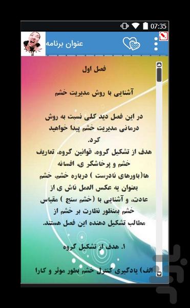 این نرم افزار بمنظور استفاده افراد دخیل در دوره آموزشی روش گروهی مدیریت خشم ،برای افراد ی که مورد سوء استفاده قرار گرفته اند و افراد تحت دوره معالجه سلامتی روان، طراحی شده است. شامل ۱۲ درس هفتگی جد اگانه پیرامون روش مدیریت خشم گروهی بهمراه خلاصه ای از مفاهیم اصلی، تمرین های بمنظور تکمیل تکالیف خانه و فضاهای خالی برای یادداشت در هر فصل می باشد. مفاهیم و مهارتهای ارائه شده در روش مدیریت خشم بوسیله تمرین و دوره و انجام دادن تکالیف آورده شده در این کتاب کار، به بهترین شیوه آموخته خواهند شد. استفاده از این کتاب کار بعنوان ابزار کمکی در کنار دوره آموزشی ۱۲ هفتگی مدیریت خشم به شما در امر ارتقا دادن مهارتهای لازم برای موفقیت در اداره و کنترل خشم، یاری خواهد رساند.چ