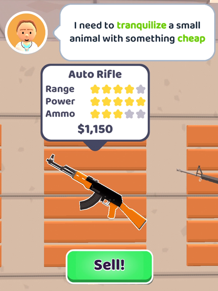 Be careful with the customers coming in the store, you never know who plans to sell you a defective gun or cheap weapons! Check and rate the guns right before making an offer. The choice is yours, and so is all that cash. Aim to make a profit in the business to become the biggest gun tycoon!