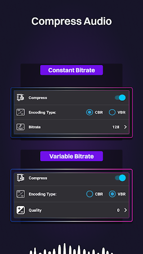 Encoding: We support both Constant Bitrate(CBR) and Variable Bitrate(VBR) encoding. When CBR is selected you can configure the audio bitrate from 32K to 320K. When VBR is selected you can choose the quality of the audio. Higher the quality larger the audio file size.