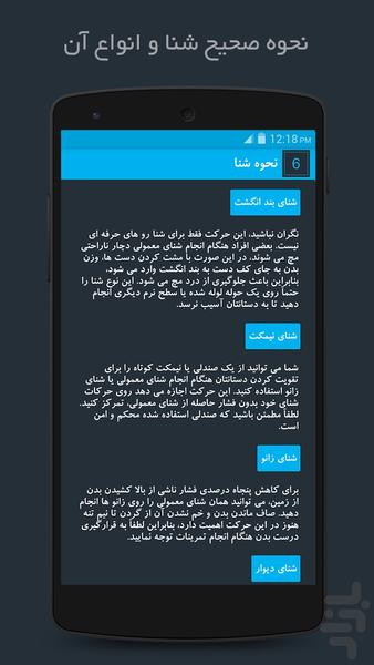برنامه به گونه ای طراحی شده که هنگام انجام حرکت شنا تعداد حرکت های شما را به صورت اتوماتیک می شمارد و در پایان هر تمرین میزان کالری مصرفی را نیز مشخص می کند و عملکرد شما را بررسی می کند. همچنین نحوه انجام انواع حرکت شنا از جمله شنای نرمال، بند انگشت، نیمکت، زانو، دیوار و ... توضیح داده شده است.