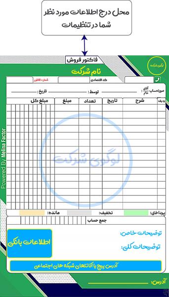 با ملینا فاکتور، میتوانید در چند ثانیه فاکتورهای دقیق و حرفهای بسازید، اطلاعات مشتریان را ثبت کنید و گزارش فروش و دریافتی های خود را همیشه در دسترس داشته باشید.و همچنین اطلاعات مورد نیاز مانند نام شرکت،لوگوی شرکت،آدرس شماره کارت،کسب و کار خود را بصورتی مدرن و جذاب بر روی فاکتور چاپ و ارسال کنید.