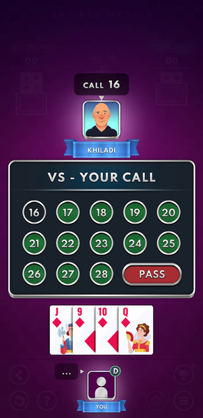 Twenty-nine or 29 (also called 28 with small changes in rules) is a very addictive and popular card game. It is played by four players in fixed partnerships. In our game, you will find all the common rules like double, re-double, full-set, pair, single hand etc. The game is played with 32 cards consisting of 8 cards from each suit. Jack (3 points), Nine (2 points), Ace (1 point) and Ten (1 point) are the only cards which have points. Thus making a total of 28 points. The players facing each other are partners.The teams need to CALL and set a target for themselves and then achieve it. The player who makes the highest CALL gets to set the trump suit thus biasing the game towards them. The opponents need to achieve 29 - (CALL) to stop the other team from winning the game. This is where the game gets its name '29'.