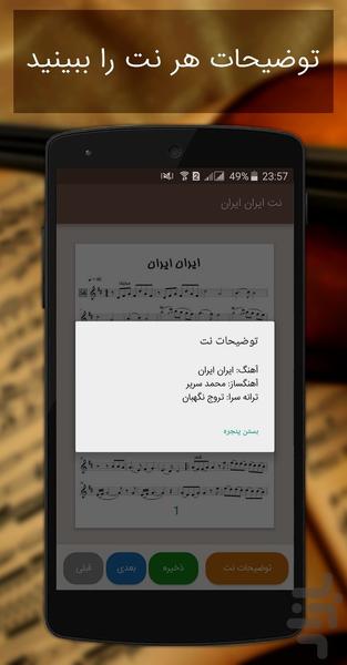 نت کده ویولن مجموعه کاملی از نت آهنگ های ایرانی برای ویولن است. ما یک مجموعه کامل از نت های ایرانی برای شما آماده کرده ایم که در زیر میتوانید امکانات و ویژگی های برنامه را مشاهده کنید.