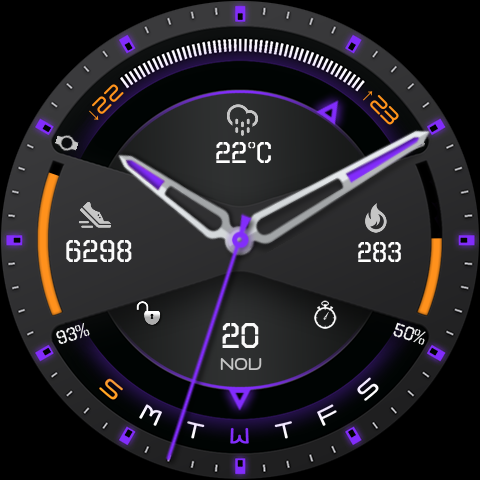 The watch face has 4 interactive tap targets on Watch face , which are fully customizable to be more informative which include number of data such as Weather, Steps, Battery level ,Date, etc..