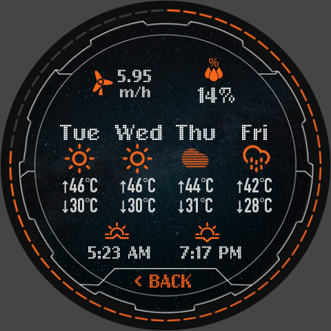 ❖ Tap on "WEATHER" on main Watch Face to get 4 days Weather Forecast and Other Weather Info.