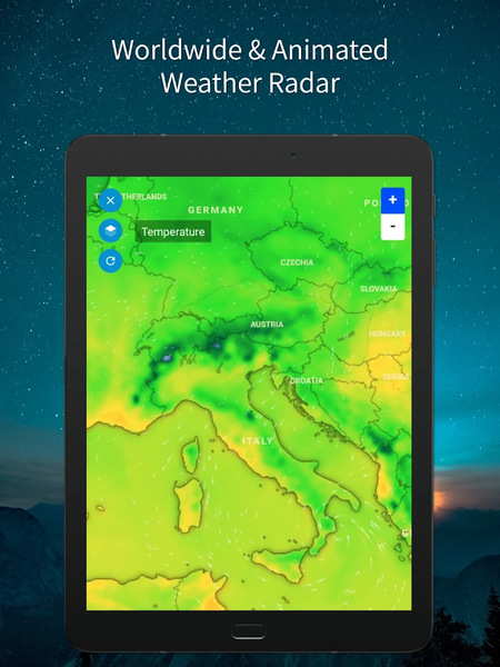 • Weather radar for any location: rainfall radar plus cloud, thunderstorms, snow and temperatures