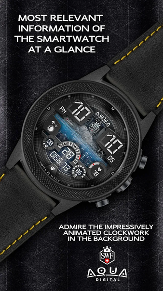SWF Swiss Watch Faces are crafted and made in Switzerland and showing an very high grade of details. With it's clear and modern design, the SWF Aqua Digital edition is built to guide you through the time of each day. Admire the impressively animated clockwork in the background while in the foreground most smartwatch information are displayed at a glance.