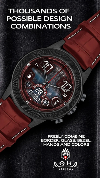 The SWF Aqua Digital PRO Series allows you to create thousands of different combinations by freely combining border, bezel, glass, numerals, quarters, hands, colors and more.