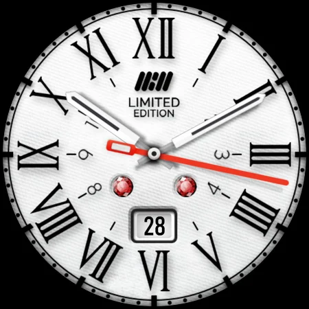 Elegant watch face; Roman numerals, customizable colors, red accents. Date display.