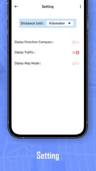 • Other settings for Enable / Disable Traffic indication on map, change map mode ( Normal, satellite,terrain) and display compass directions.