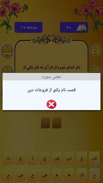 مثلا وقتی روی دکمه محتوای سوره کلیک کنید محتوای سوره نشان شما داده می شود و شما می بایستی از روی آن نام سوره را حدس بزنید.