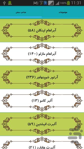 ●●در این برنامه شما هم می توانید براساس دسته بندی و هم براساس فردی که سخن را گفته است سخنان را مشاهده کنید.