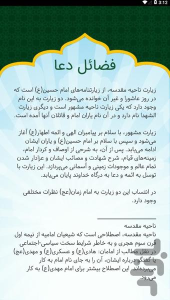 زیارت ناحیه مقدسه نام یک دعای مورد استفاده شیعیان دوازده امامی ایران است. این دعا در روز عاشورا خوانده میشود و به زیارت حسین بن علی در روز عاشورا معروف است. به باور شیعیان دوازده امامی این دعا از حجت بن حسن، در وصف حادثه کربلا و عاشورا گفته شده است. زیارت ناحیه مقدسه با درود بر پیامبران و اهل بیت، محمد و حسین و یارانش در کربلا آغاز میشود. پس از آن، به شرح کامل اوصاف و کردار حسین پیش از جنگ، زمینههای جنگ او، شرح کشته شدن و سختیهای او، و عزادار شدن تمام عالم و موجودات زمینی و آسمانی میپردازد. در پایان، با توسل به اهل بیت و دعا، دعا پایان میپذیرد.با دلگرم همراه باشید.