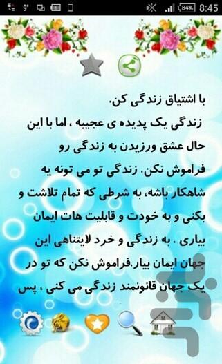 این برنامه شامل جملات زیبا و الهام بخش می باشد که با طراحی زیبا در اختیار شما قرار می گیرد. این جملات قابل ارسال از طریق sms ، وایبر ، ایمیل و .... هستند.