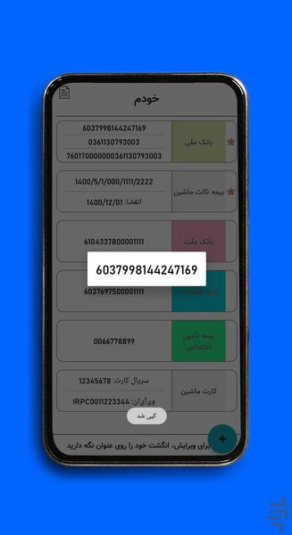 این برنامه کمک میکند که همه این اطلاعات بهمراه توضیحات بیشتر نظیر شماره تلفن، ایمیل، آدرس یا هرچیز دیگری را بصورت متمرکز در یکجا داشته باشیم؛ و هرگاه به آنها نیاز داشتیم فقط با لمس کردن آن، شماره مورد نیاز در حافظه گوشی کپی شده تا در هرجایی نیاز بود جایگذاری شود.