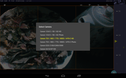 The app is a digital director's viewfinder -- it helps you see the exact field of view for your future shot. Select the camera from the menu and rotate the wheel to select the focal length of the lens.