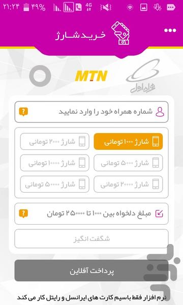 نرم افزار خرید شارژ وبسته اینترنت برای سیم کارت های،ایرانسل،رایتل،همراه اول وتالیا