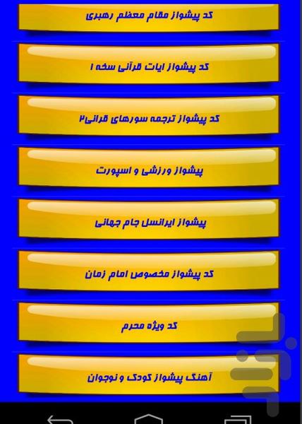 در قسمت کد ها ویژه کد:1_ کد پیشواز سخنرانی های مقام معظم رهبری 2_کد پیشواز سورهای قرآنی 3_کد پیشواز ترجمه های قرانی 4_کد پیشواز مخصوص امام زمان 5_ ویژه رمضان 6_کد ویژه محرم 7_کد پیشواز جام جهانی 8_کودک و نوجوان 9_کد پیشواز ملی ورزشی کشورها 10_کد پیشواز تیم های فوتبال استقلال و پیروزی و سپاهان 11_کد پیشواز قرانی (2)