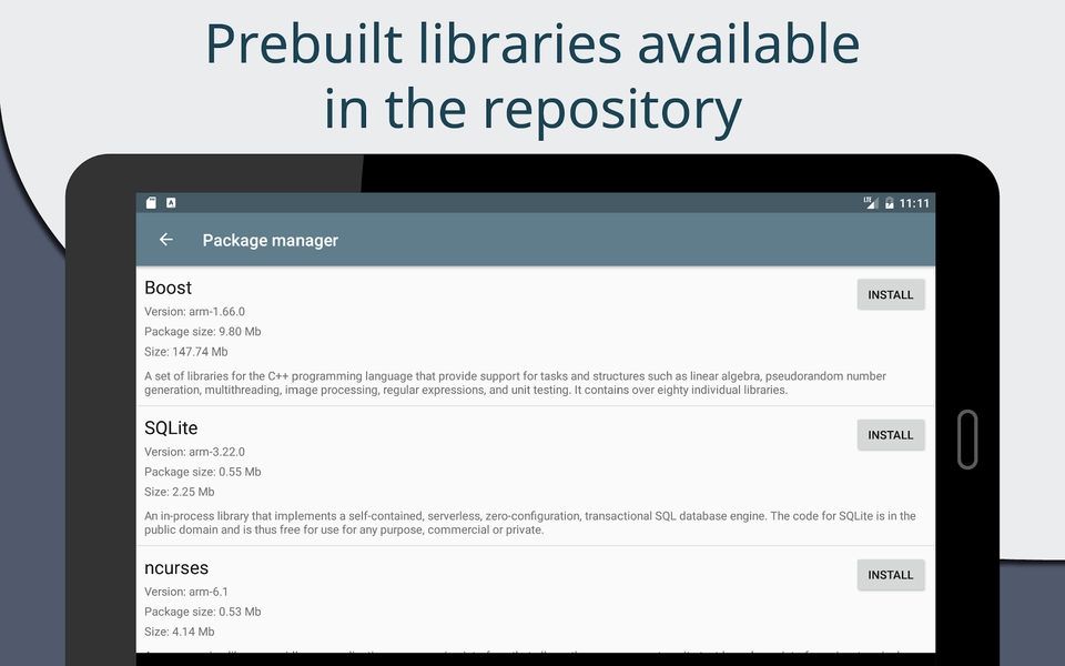 Important notice: Cxxdroid requires at least 150MB free internal memory. 200MB+ is recommended. More if you are using heavy libraries such as Boost.