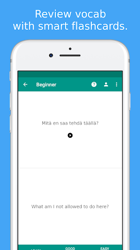 Simply Learn Finnish Language App is a FREE language app that will assist you to speak Finnish quickly and effectively.All Finnish phrases and words are presented to you in both phonetic and original Finnish writing. They are recorded by a native speaker from Finland.Save your favorite phrases and words to review them without fuss.Study your vocabulary with flashcards using the spaced repetition technique.Test your knowledge with fun Finnish language quiz and review your score.★★★ Survive when travelling in Finland ★★★ Use the Finnish phrasebook to survive in Finland. All important survival phrases are included.For example, let the app speak to the Taxi driver in Finland to show them where you want to go.Search all phrases and words to quickly access what you need.★★★ Main Features ★★★✓ 300+ free Finnish phrases and words
