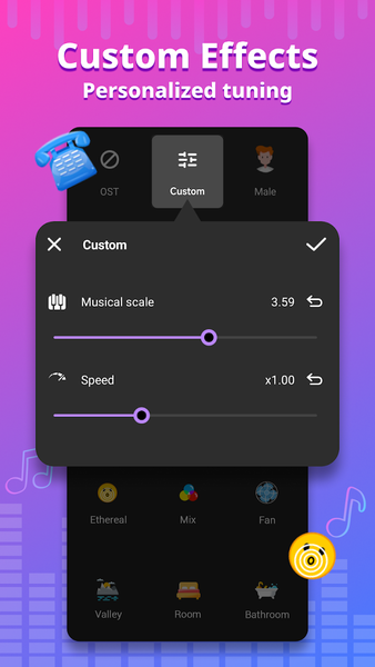 Male, Female, baby, Uncle, Monster, Robot, Alien, Wasp, Chipmunk, Ethereal, Mix, Fan, Valley, Room, Bathroom, Karaoke, Sewer, Underwater, Devil, Telephone, Phonograph, Chorus, Trill, Cave, Serenity, Radio, Loudspeaker, Rotate